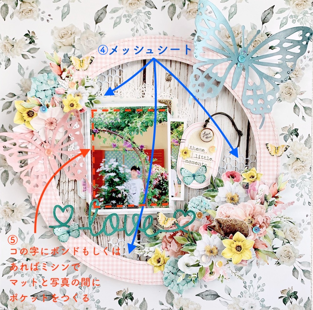 ⑥;5inchサイズのドイリー→ヴェラム(約4.75×3.5)→⑤の順に台紙に貼る
